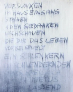die beiden ersten entstandenen zeichnungen „friedens.reich im frankenland & labil zugleich“ und „sprechende LAUT.box“ haben rueckseitig handschriftliche gedichte, die gedankenspiele oder konversationen der personen auf der vorderseite sind . die in der folge auf eigene blaetter mit schreib.maschine uebertragenen wurden mit weiszer kreide und teilweise graphit weiterbearbeitet - sie sind nun jeweils neben den zeichnungen zu betrachten .